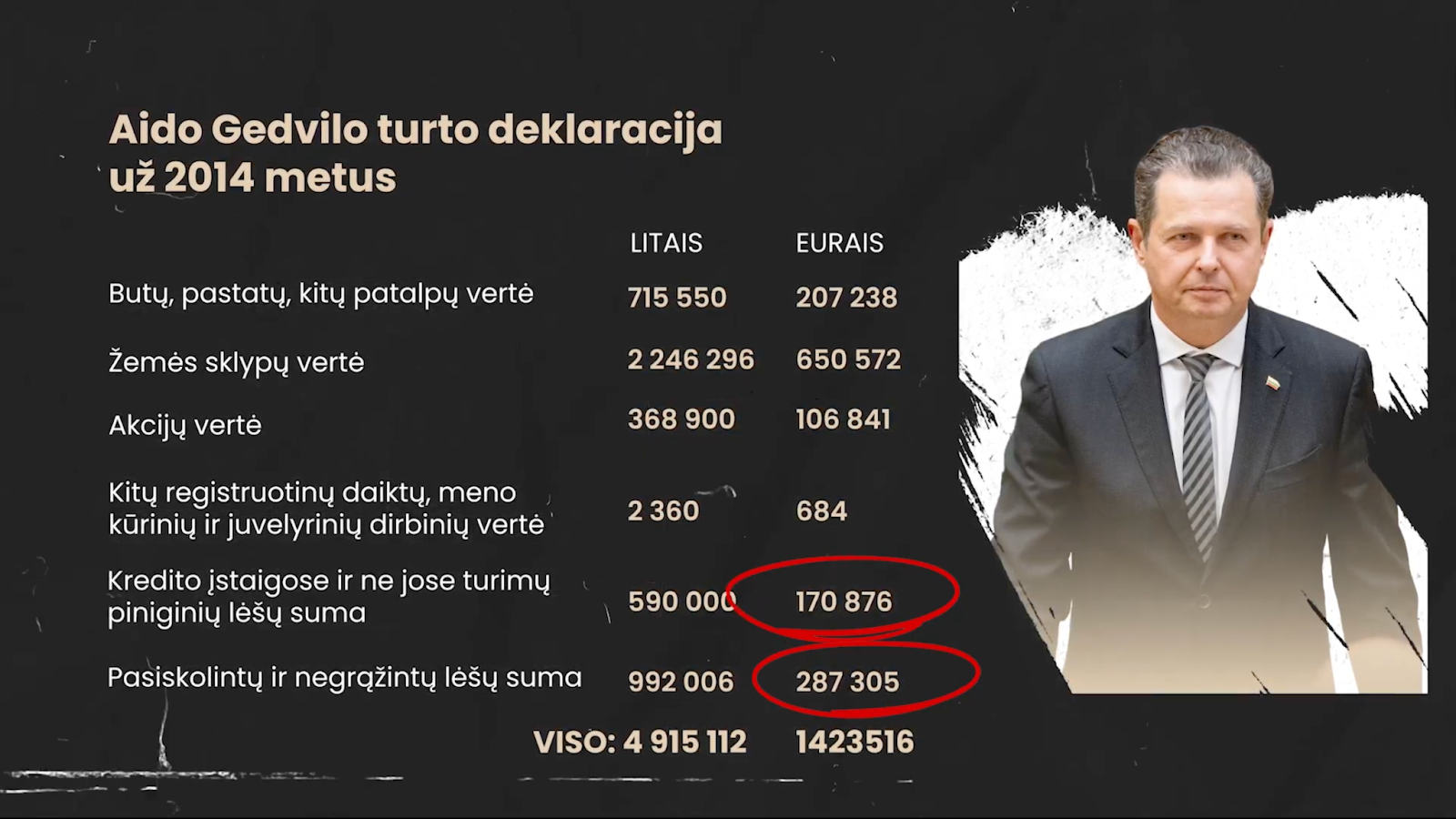 Taigi milijonines prievoles prisiėmęs politikas po metų neturėjo jokių skolų ir tebeturėjo tiek daug vertingo turto, tiek solidų piniginių lėšų kiekį. Nors metinės A. Gedvilo pajamos tuo metu siekė vos 9 tūkstančius eurų.